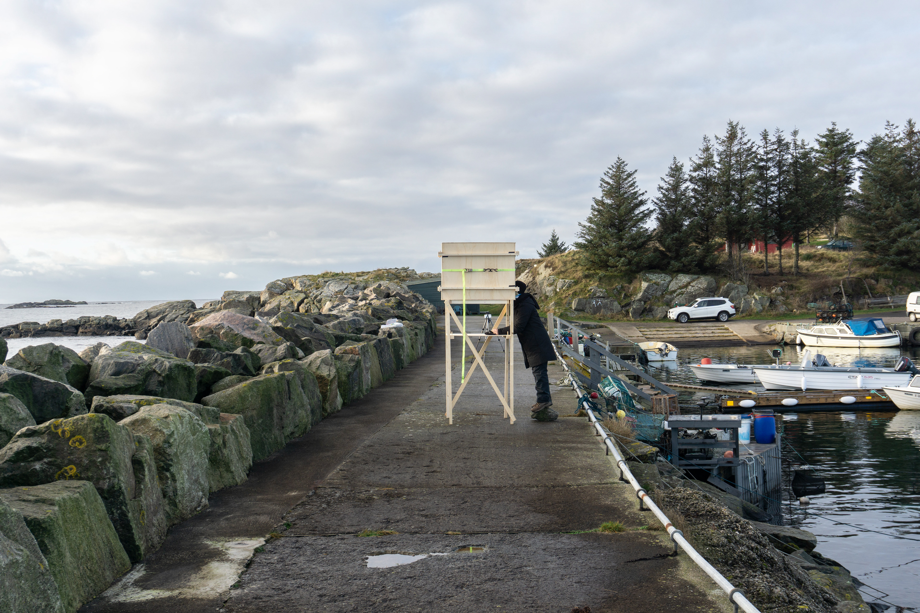 The Machine Obscura was our fourth project in the obscura series at Lista and an important part of Learning from Lista. We wanted to make something where the head would be inside of the obscura, but the body would still be a part of the landscape you’re watching. Another aim was for our new obscura to have a functioning construction, to be portable and easy to move around. With our new tool we continued to explore places at Lista in a different way. Driving around at Lista with our machine flat-packed in the car, setting it up in different environments.